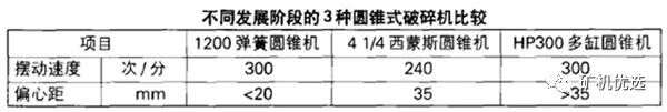 因此,設(shè)計(jì)的先進(jìn)性在于盡可能為層壓破碎創(chuàng)造條件,采用腔形設(shè)計(jì)和加大破碎力就是有效的措施。以主軸擺動速度和偏心距為例,不同發(fā)展階段的3種圓錐式破碎機(jī)性能也不同(見下表)。